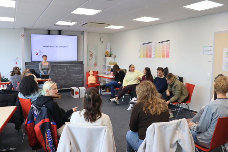 Wie reagiere ich richtig, wenn ein Kind plötzlich bewusstlos wird? Was kann ich tun, wenn ein Krampfanfall auftritt oder eine starke Blutung gestillt werden muss? Mit diesen Fragen beschäftigten sich die angehenden Erzieher*innen der ANGELL Akademie am 09.10. in einem praxisnahen Erste-Hilfe-Kurs, den Sophie Carson leitete.