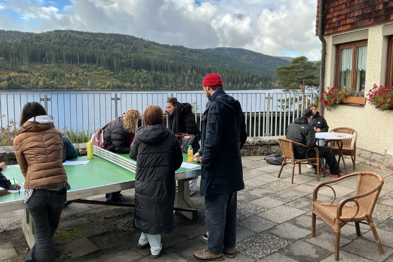 Unsere BKSP-Gruppe verbrachte eine erlebnisreiche Nacht in der Jugendherberge Wolfsgrund am Schluchsee – kurz, aber intensiv! Nach der Ankunft starteten die Schüler*innen mit Kennenlernspielen auf der Terrasse: Beim Bingo und einem kreativen Portrait-Spiel, bei dem man sich gegenseitig zeichnete, war viel Lachen garantiert. Anschließend ging es in den Ort Schluchsee zur Stadtrallye, die mit einem Unentschieden endete. Das wollten die Gruppen natürlich nicht auf sich sitzen lassen – also folgte ein Spaziergang am See mit kleinen Challenges, darunter das beliebte „Eisschollen-Spiel“. Nach etwas Freizeit und einem leckeren Abendessen ließen alle den Tag gemütlich ausklingen.